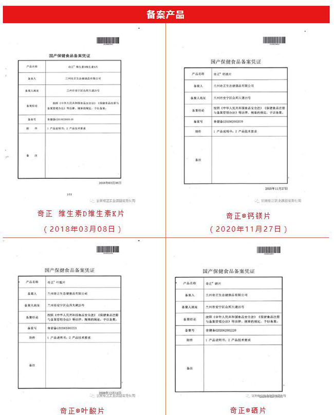 2020年11月27日、12月14日奇正健康品公司三項(xiàng)備案產(chǎn)品,“奇正®鈣鎂片”、“奇正®葉酸片”、“奇正®硒片”分別通過甘肅省市場(chǎng)監(jiān)督管理局保健食品備案審批,獲得三張保健食品備案憑證。