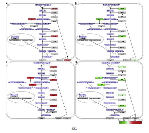 有趣的是,在海馬體和運(yùn)動(dòng)皮層中,與對(duì)照組健康大鼠相比,在安慰劑組CP大鼠中,各種膽固醇代謝途徑的催化酶的表達(dá)上調(diào),與安慰劑組CP大鼠(圖1)相比,白脈軟膏組各種膽固醇代謝途徑的催化酶的表達(dá)下調(diào)。同時(shí),膽固醇合成途徑中的Hmgcs1、Idi1和sql催化酶也發(fā)生了類(lèi)似的改變。運(yùn)動(dòng)皮質(zhì)中只有Mvd、Fdps和Dhcr7發(fā)生改變,而海馬中沒(méi)有。與安慰劑組CP大鼠相比,白脈軟膏組CP大鼠Rps6ka1表達(dá)明顯降低。同樣,第40S核糖核糖核糖蛋白R(shí)PS8、RPS9、RPS25和RPS27的表達(dá)也受到了控制。