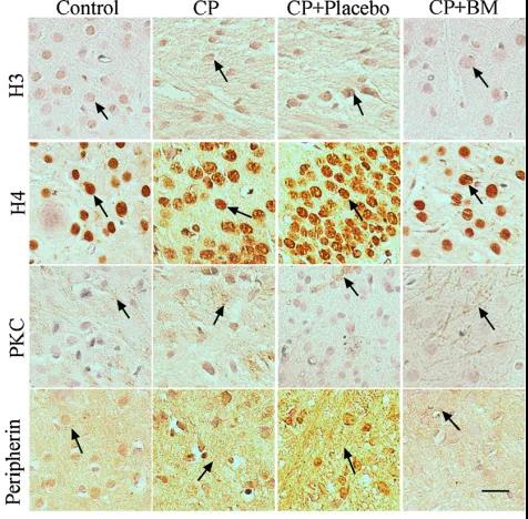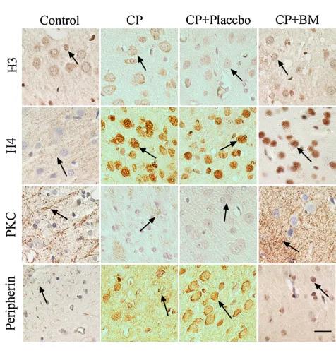 使用免疫組化法定位大鼠海馬中CP相關(guān)蛋白的表達(dá)(圖2),與對(duì)照組相比,在安慰劑CP大鼠中,組蛋白3.3和組蛋白4的表達(dá)被下調(diào)。然而,與對(duì)照組和安慰劑組相比,白脈組CP大鼠組蛋白3.3和組蛋白4表達(dá)上調(diào)。與對(duì)照組相比,模型組CP大鼠和安慰劑組CP大鼠的PKC-δ和外周蛋白表達(dá)上調(diào);然而,與對(duì)照組和安慰劑組相比白脈治療組CP大鼠的PKC-δ和周?chē)鞍妆磉_(dá)下調(diào)。