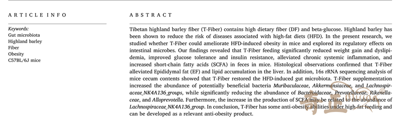 青稞高纖粉(T-fiber)含有較高的膳食纖維(DF)和β-葡萄糖。青稞已被證明可以降低與高脂肪飲食(HFD)相關(guān)的疾病風(fēng)險。這篇論文主要研究了西藏青稞高纖粉(T-fiber)是否能改善HFD誘導(dǎo)的小鼠肥胖,并探討了其對腸道微生物的影響。結(jié)果表明,青稞高纖粉(T-fiber)喂養(yǎng)能夠顯著減少小鼠體重增加、改善葡萄糖耐量和胰島素抵抗、緩解慢性全身炎癥,同時小鼠糞便中短鏈脂肪酸(SCFA)也有增加。總之,青稞高纖粉(T-fiber)具有一定的抗肥胖能力,可以作為相關(guān)的抗肥胖產(chǎn)品來進(jìn)行開發(fā)。