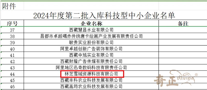 2024年11月7日西藏自治區(qū)科學(xué)技術(shù)廳發(fā)布了“關(guān)于2024年度第二批擬入庫(kù)科技型中小企業(yè)名單的公示”,科技型中小企業(yè)認(rèn)證是對(duì)企業(yè)技術(shù)實(shí)力和經(jīng)營(yíng)管理能力的有力肯定,林芝雪域資源科技有限公司獲此殊榮。